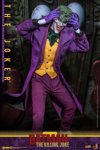 Sideshow y Hot Toys se enorgullecen en presentar la figura coleccionable a escala 1/6 de The Joker , inspirada en el cómic Batman: The Killing Joke . La figura de acción incluye dos esculturas de cabeza de nuevo desarrollo equipadas con globos oculares giratorios, arrugas detalladas, maquillaje y cabello verde rizado meticulosamente esculpido que completa el rostro inquietante. Una escultura de cabeza presenta una expresión sonriente con la boca abierta, con una lengua que se puede unir magnéticamente; la otra tiene una expresión de guiño y sonrisa, con un sombrero removible que es intercambiable con ambas esculturas de cabeza. El Joker está vestido con su atuendo preciso de cómic, que viene con un abrigo y una chaqueta morados con alambre incrustado sobre un chaleco amarillo, camisa negra, cinta verde, cinturón negro y pantalones morados combinados con zapatos negros. Viene con ocho manos enguantadas intercambiables, los coleccionistas pueden posarlo con sus icónicas poses expresivas. Fiel a los paneles originales, sus armas vienen con un pequeño cuchillo y una pistola que dispara una bandera de «Click Click Click». También se incluyen una cámara, un bastón y una carta del Joker. Completa el conjunto un fondo con la portada del cómic Batman: La Broma Asesina, que se puede montar en la base especialmente diseñada para la figura.