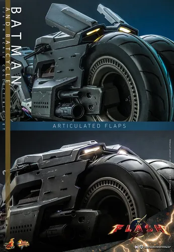 Basado en el vehículo que se ve en el tráiler de The Flash , el accesorio Batcycle Sixth Scale se recrea con extrema precisión y aplicaciones de pintura fina, mide 56,5 cm de largo, presenta un diseño de función de iluminación LED (funciona con alimentación USB) en las luces delanteras y traseras, ajustable Manillar y ruedas de varios grados, ruedas de goma giratorias con un patrón de banda de rodadura realista, un accesorio de embestida del vehículo acoplable, además de detalles mecánicos de alta precisión que se muestran en las armas laterales, el motor, el marco y el escape. Bases de exhibición también incluidas.