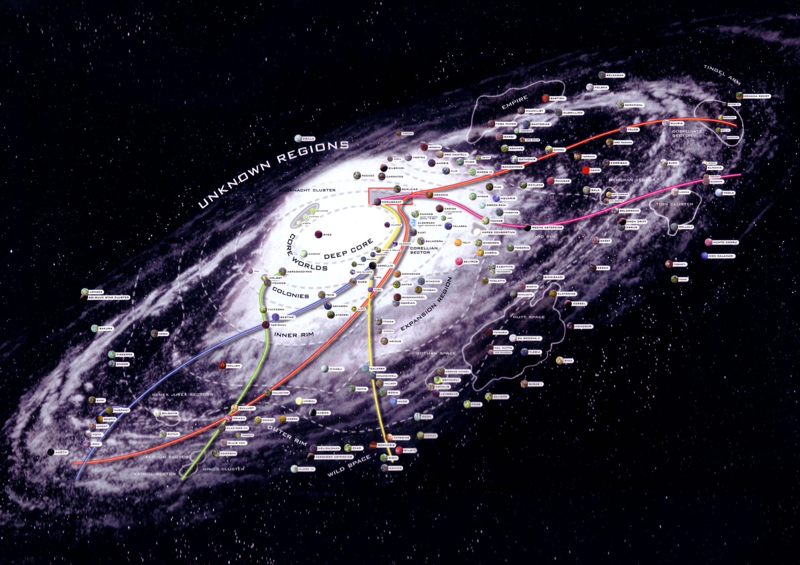 - Núcleo Interior: el corazón de la galaxia, una densa masa de estrellas por las cuales es muy complejo el viaje. Imposible su transito hasta que el Imperio descubrió alguna hiperruta.